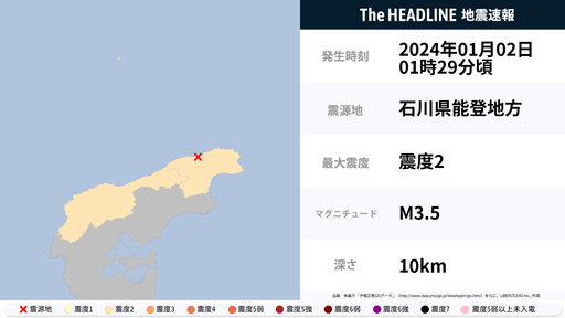 1月2日1時29分頃、石川県で最大震度2の地震を観測