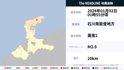1月2日1時55分頃、石川県で最大震度2の地震を観測