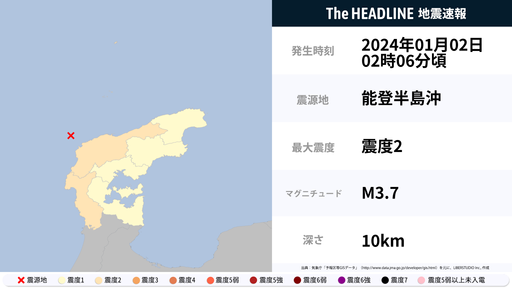 1月2日2時30分頃、石川県で最大震度2の地震を観測