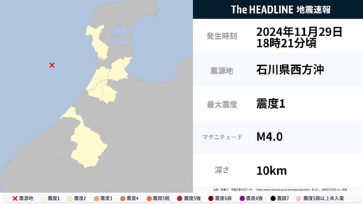 11月29日22時14分頃、石川県で最大震度1の地震を観測