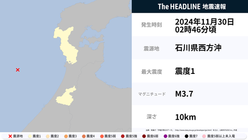 11月30日2時46分頃、石川県で最大震度1の地震を観測