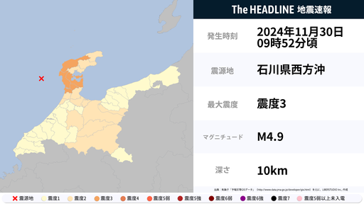 11月30日9時52分頃、石川県で最大震度3の地震を観測