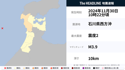 11月30日10時22分頃、石川県で最大震度2の地震を観測
