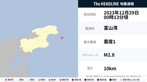 12月29日0時13分頃、石川県で最大震度1の地震を観測