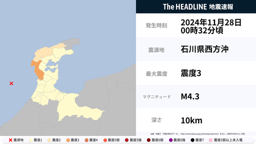 11月28日0時32分頃、石川県で最大震度3の地震を観測