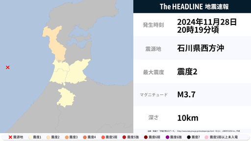 11月28日6時14分頃、石川県で最大震度2の地震を観測