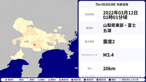 3月12日09時20分頃、山梨県で最大震度2を観測する地震がありました。