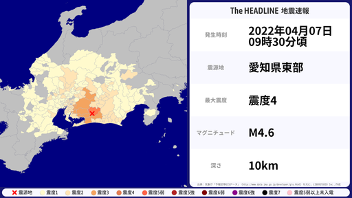 4月7日09時30分頃、愛知県で最大震度4を観測する地震がありました。