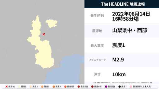 8月14日16時58分頃、山梨県・静岡県で最大震度1の地震を観測