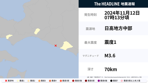 11月12日7時14分頃、北海道で最大震度1の地震を観測