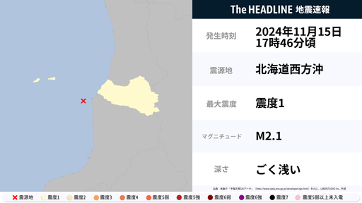 11月15日17時46分頃、北海道で最大震度1の地震を観測