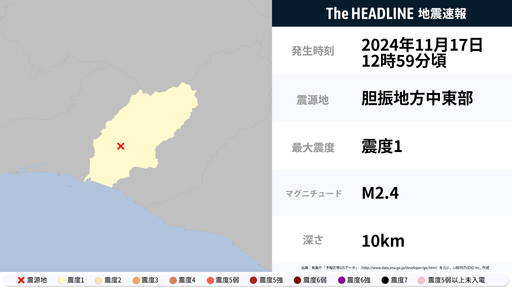 11月17日12時59分頃、北海道で最大震度1の地震を観測