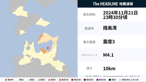 11月24日8時22分頃、青森県・岩手県で最大震度3の地震を観測