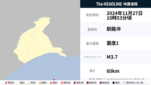 11月27日10時54分頃、北海道で最大震度1の地震を観測