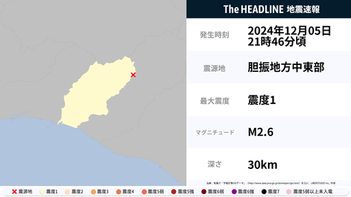 12月5日21時46分頃、北海道で最大震度1の地震を観測