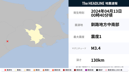 4月13日0時40分頃、北海道で最大震度1の地震を観測