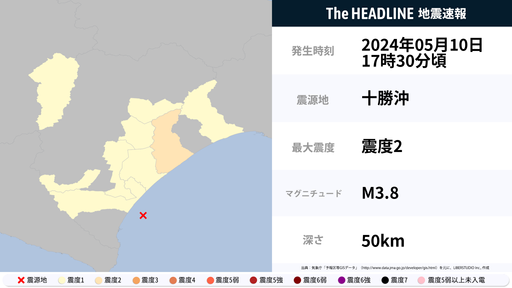 5月10日17時30分頃、北海道で最大震度2の地震を観測