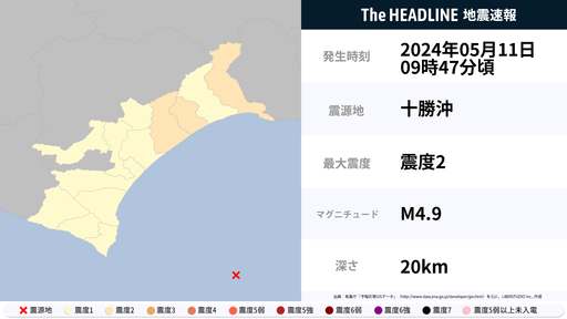 5月11日9時47分頃、北海道で最大震度2の地震を観測