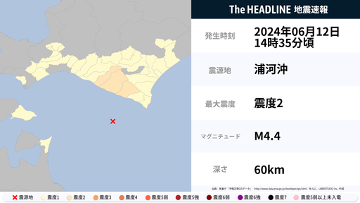 6月12日14時35分頃、北海道で最大震度2の地震を観測