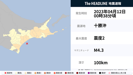 4月12日0時38分頃、北海道で最大震度2の地震を観測