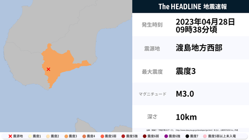 4月28日9時38分頃、北海道で最大震度3の地震を観測