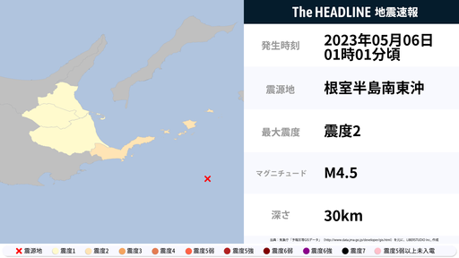 5月6日1時1分頃、北海道で最大震度2の地震を観測