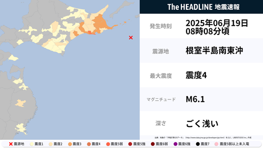 6月19日8時8分頃、北海道で最大震度4の地震を観測