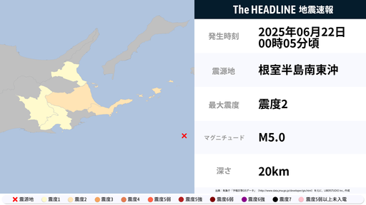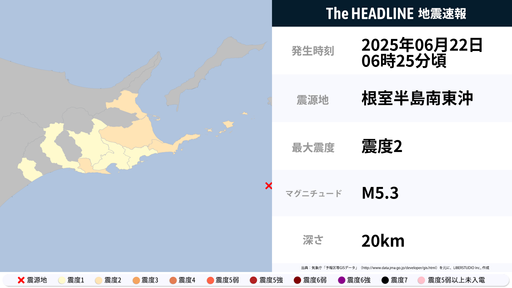 6月22日6時25分頃、北海道で最大震度2の地震を観測