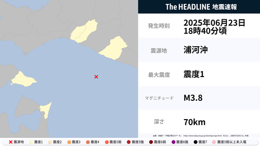 6月23日18時41分頃、北海道・青森県で最大震度1の地震を観測