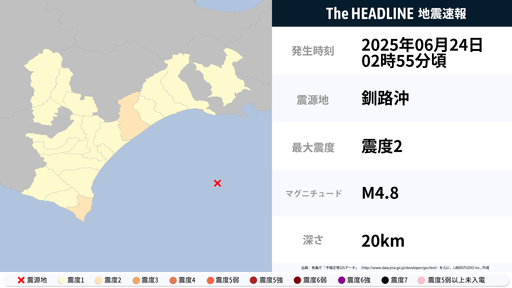 6月24日2時55分頃、北海道で最大震度2の地震を観測