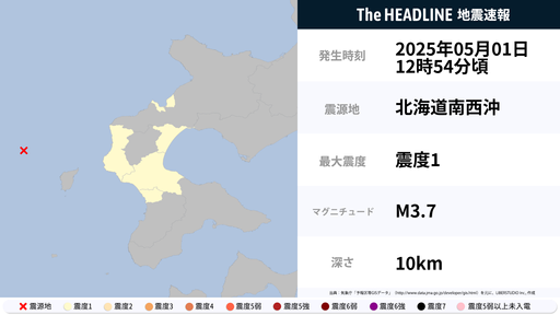 5月1日12時55分頃、北海道で最大震度1の地震を観測