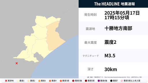 5月17日17時15分頃、北海道で最大震度2の地震を観測