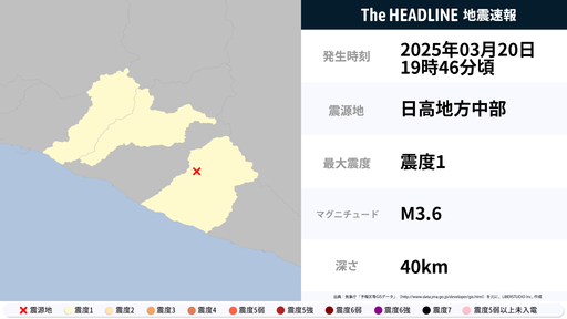 3月20日19時46分頃、北海道で最大震度1の地震を観測