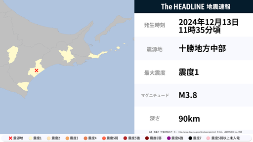 12月13日11時35分頃、北海道で最大震度1の地震を観測