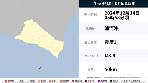 12月14日5時53分頃、北海道で最大震度1の地震を観測