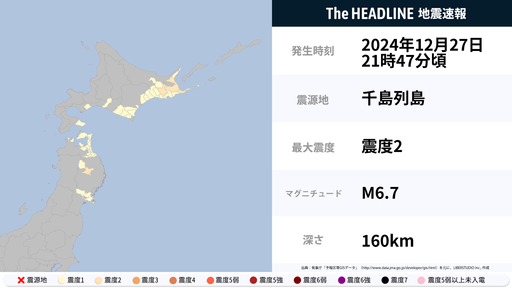 12月27日21時48分頃、北海道・岩手県で最大震度2の地震を観測
