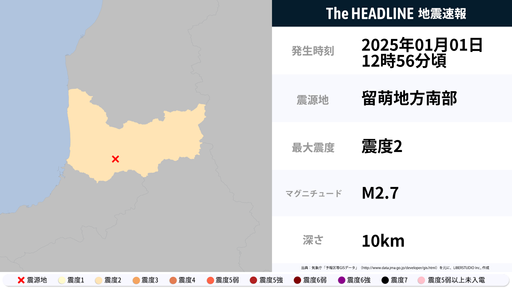 1月1日12時56分頃、北海道で最大震度2の地震を観測