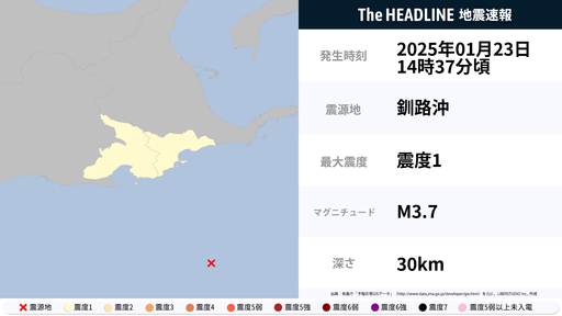 1月23日14時37分頃、北海道で最大震度1の地震を観測