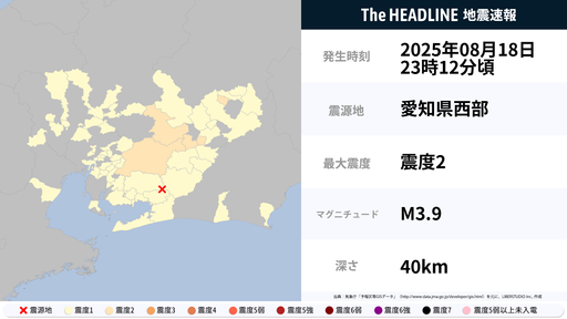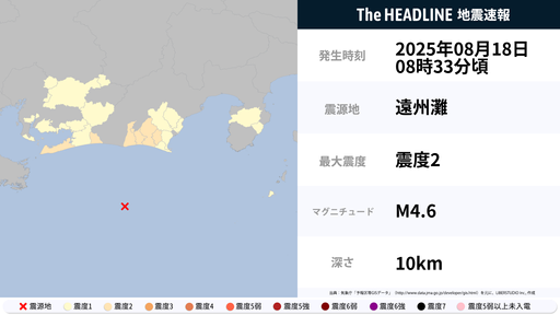8月18日8時33分頃、静岡県・愛知県で最大震度2の地震を観測