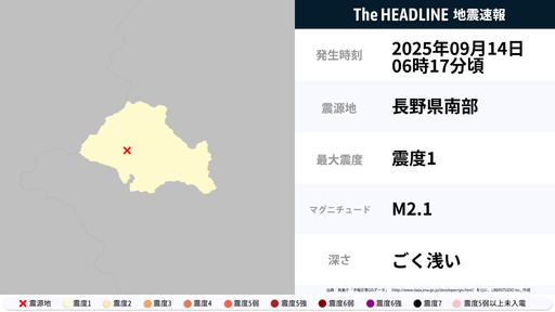 9月14日6時18分頃、長野県で最大震度1の地震を観測
