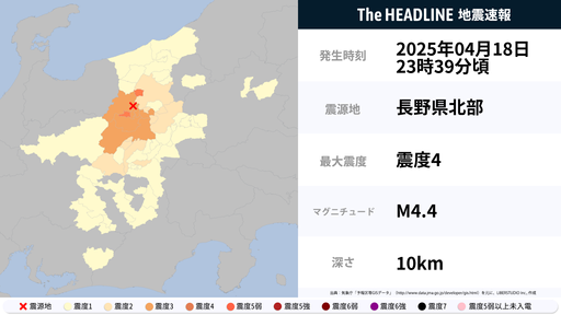 4月18日23時39分頃、長野県で最大震度4の地震を観測