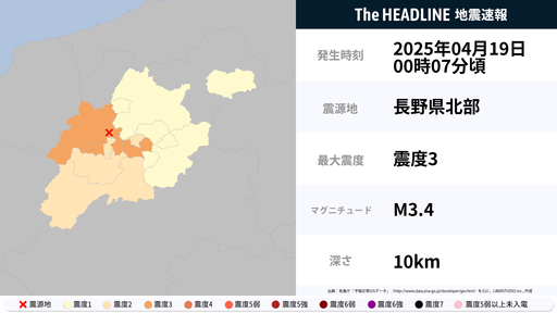 4月19日0時8分頃、長野県で最大震度3の地震を観測