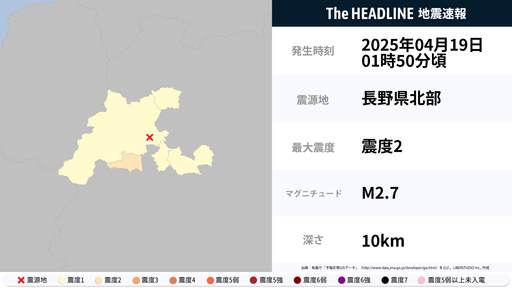 4月19日1時50分頃、長野県で最大震度2の地震を観測
