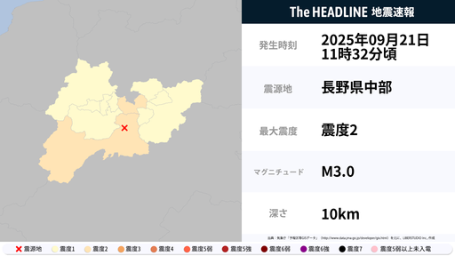 9月21日11時32分頃、長野県で最大震度2の地震を観測