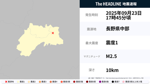 9月23日17時46分頃、長野県で最大震度1の地震を観測