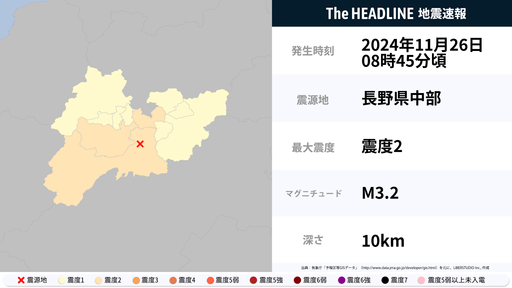11月26日8時45分頃、長野県で最大震度2の地震を観測