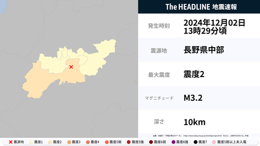 12月2日13時29分頃、長野県で最大震度2の地震を観測