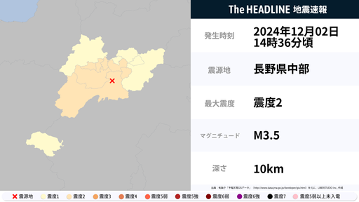 12月2日14時36分頃、長野県で最大震度2の地震を観測
