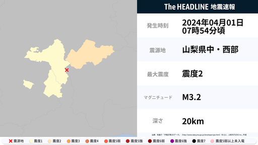 4月1日7時54分頃、山梨県で最大震度2の地震を観測