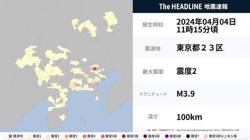 4月4日11時16分頃、東京都・神奈川県で最大震度2の地震を観測